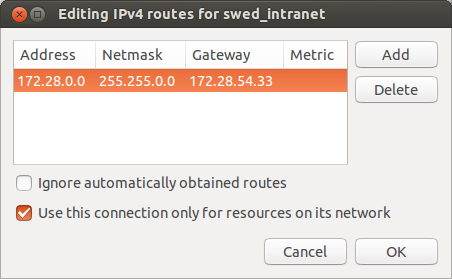 | Next go to "IPv4 Settings" tab (or v6, depending on your network). Click "Routes..." button. |